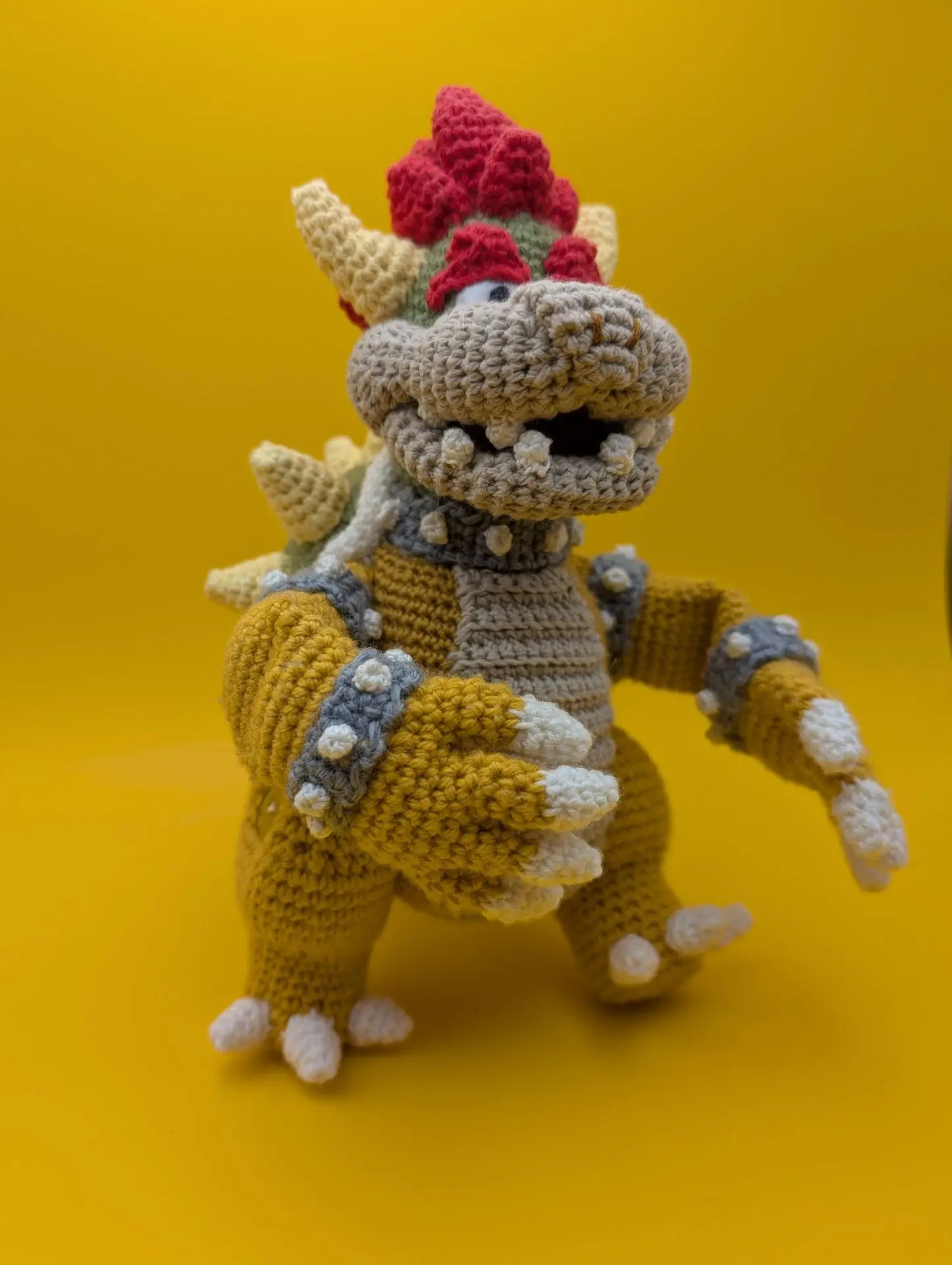 I used a pattern by GretaWings to make this fanart, as well as a variety of yarns, including wool, silk, cotton, and linen. I made a few modifications to the pattern. For one, I cut pieces of dense needle-felted wool into shape to give his feet and spikes their distinctive shape. It's a technique I hope to use a lot more often, since it's lightweight but extremely sturdy and holds its shape beautifully.