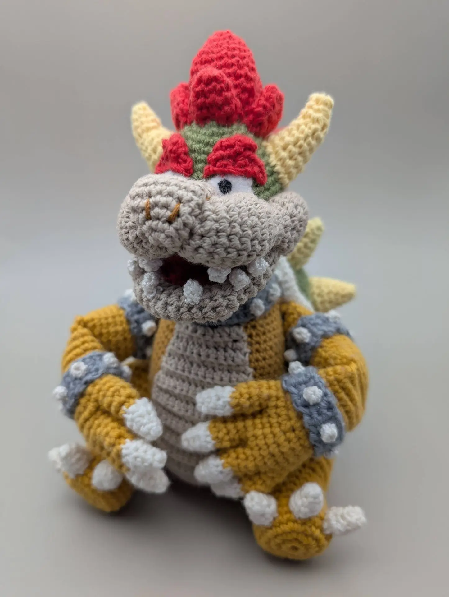 I used a pattern by GretaWings to make this fanart, as well as a variety of yarns, including wool, silk, cotton, and linen. I made a few modifications to the pattern. For one, I cut pieces of dense needle-felted wool into shape to give his feet and spikes their distinctive shape. It's a technique I hope to use a lot more often, since it's lightweight but extremely sturdy and holds its shape beautifully.